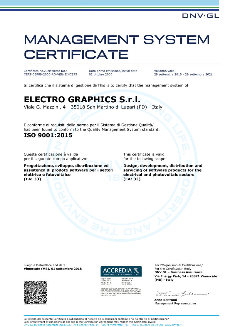 ContatosA certificação do sistema de qualidade da empresa de acordo com UNI EN ISO 9001:2015, emitido pela DNV-GL, líder mundial em emissão de certificados, é o reconhecimento apropriado de uma realidade qualitativa construída ao longo do tempo, o que inspira cada processo ELECTRO GRAPHICS e orienta os profissionais na busca da satisfação do cliente.