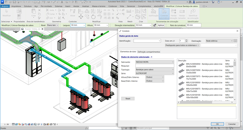 O electroBIM é um plug-in para Autodesk Revit®, desenvolvido pela Electro Graphics para auxiliar no projeto de sistemas de distribuição elétrica no ambiente BIM. O software permite a gestão de condutos elétricos com base em um catálogo de produtos comuns e associa informações relevantes às funções de modelagem em 3D no Revit, para criar caminhos de cabo de acordo com o produto escolhido. Um gerenciador dedicado permite a definição de dispositivos elétricos, com suporte de um navegador que simplifica e acelera o acesso aos dados típicos (tensão, potência, corrente, fator de potência, tipo de cabo e instalação).